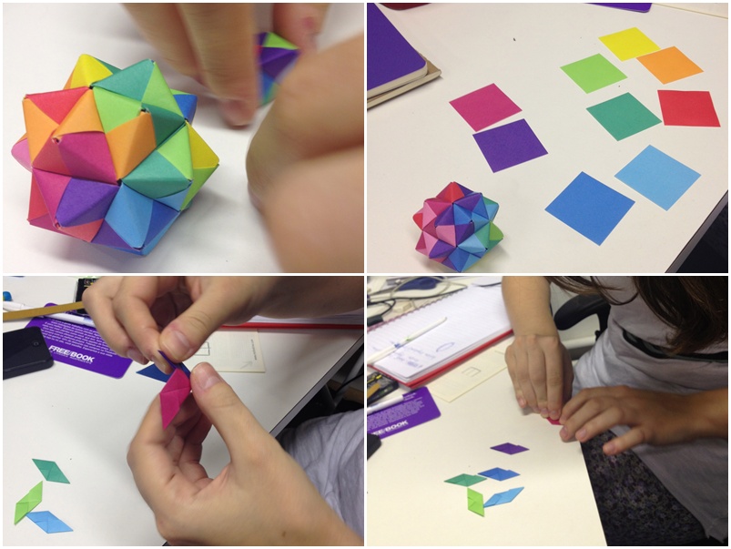 Mas ela diz que não é bem assim, os arrepios são totalmente desnecessários. É preciso, claro, parar, gastar um tempo e atenção para montar as formas. No entanto, é um passo a passo como qualquer outro: possível. Daí que combinamos com ela uma aulinha das dobraduras pra dividir com vocês.
