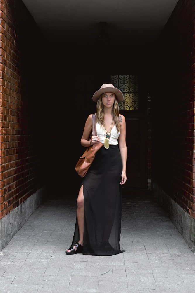 Domingo 15h: “Domingo é dia de acordar tarde e almoçar no fim do dia em algum lugar gostoso, com o namorado. Vesti uma roupa que ficasse boa também à noite, caso a gente decidisse ir ao cinema.” Top de brechó - Saia Acervo Collection - Colares Luiza Dias 111 - Bolsa roubada da mãe - Sandália Elizabeth de Senneville Melissa - Chapéu Urban Outfitters / Créditos: Luiza Campos