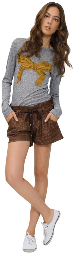 | O shortinho é estilo “clochard”, de cintura mais alta e folgado, amarrado por um cadarço. Este é de alfaiataria e fica lindo usado com a blusinha por dentro. Short Zinco R$ 214 Tênis Keds R$ 179 |