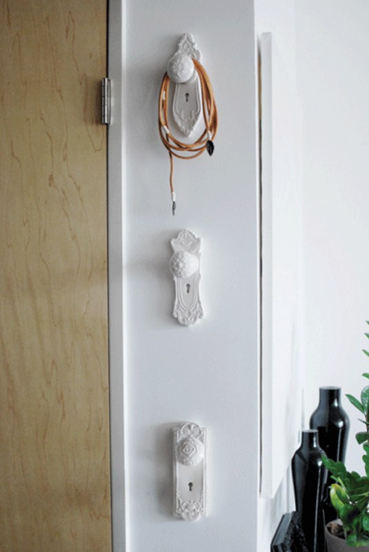 Maçanetas também cumprem bem o papel de cabideiro de parede. Os modelos antigos e bem rococós podem ser pintados com spray e presos diretamente na parede / Créditos: Reprodução