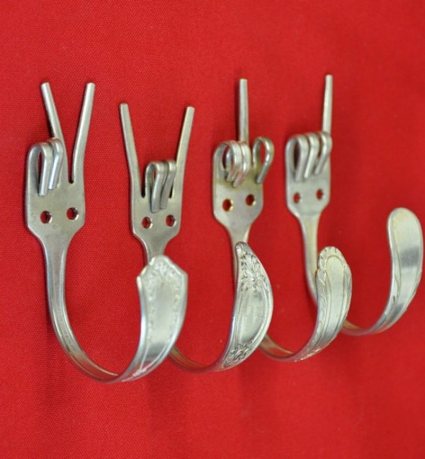 ... ou garfos! Esses modelos de ganchos estão à venda na Etsy, mas se você quiser usar os seus próprios garfos, é possível. Só vai ser difícil furá-los. Então recomendo usar fitas adesivas para fixá-los na parede. Mas aí fique atenta para não pendurar algo muito pesado, tá?! / Créditos: Reprodução