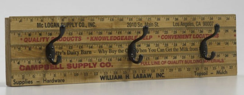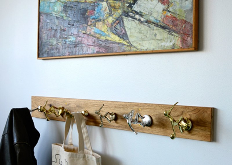 Já os modelos de maçaneta menos rebuscados podem ser fixados numa base de madeira, servindo como ganchos. Nessa imagem, a base foi feita com uma parte de uma porta que seria descartada / Créditos: www.apartmenttherapy.com