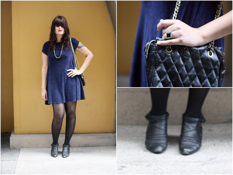 Sábado: "Hoje é o show do Nouvelle Vague, e a ocasião tem tudo a ver com um look mais vintage. Acabei me inspirando bastante nos Raveonettes, banda que tem alguns clipes com atmosfera bem retrô e noir. A franja cobrindo os olhos é uma referência à vocalista Sharin Foo e à Karen O, que sempre usam o cabelo assim. Mas aprendi a usar o cabelo desse jeito combinando com um batonzão vermelho com a Brody Dalle, eterna vocalista dos Distillers. Essa bolsa da Seraphine é o meu xodó e costumo usá-la sempre. O anel foi presente da minha mãe que sabe o quanto eu gosto de acessórios vintages" - Vestido Le Lis Blanc - Colar Accessorize - Bota Bottero - Bolsa Seraphine / Créditos: Mariana Hasselmann