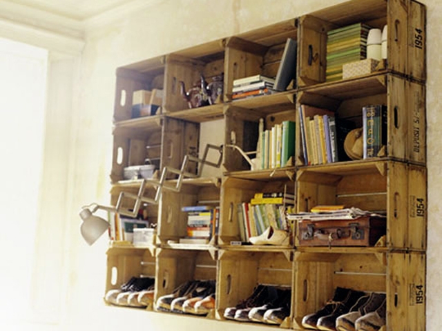 05. Caixotes de feira viram boas estantes também. Uma limpadinha, uma lixadinha e uma demãozinha de verniz são suficientes / Créditos: Reprodução