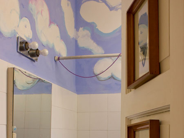 08. Se você prefere trabalhar com tinta, pode pintar um céu no seu banheiro – ou em qualquer outro lugar. Base azul, um stencil em forma de nuvem e spray branco dão conta do recado / Créditos: Reprodução