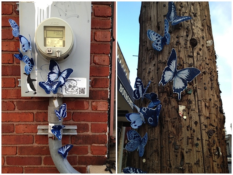 No caso da arte de Tasha, o papel e os imãs não só são características de seus animais, mas necessários pras intervenções que faz com eles pelos espaços urbanos de Indianópolis, sua cidade natal. Dessa forma, toda estrutura magnética vira tela em branco para suas borboletas e cervos azulados. Com as borboletas, é como se elas pousassem aos montes em postes, caixas de correio, portões, estátuas e containers de lixo reciclável. Já os cervos, permeiam vitrines de lojas.
