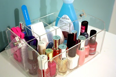 Ideias simples e muito práticas resolvem a questão em um minuto. Uma bandeja de prata, por exemplo, além de manter os vidros sempre a mão, dão uma graça a mais pro seu cantinho de beleza. Para as afixionadas pelas cores das unhas, cestos utilitários, daqueles maiores mesmo, são uma opção barata e funcional. Nesse caso, pintar as tampas dos vidros com as cores do esmalte facilita a encontrar a cor desejada no meio de tantos.