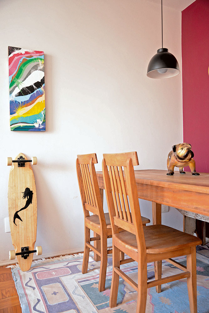 A publicitária Fabiana Gimenez, 34 anos, comprou seu apartamento em Perdizes, São Paulo, há sete anos. Com 85 metros quadrados, o espaço tem cômodos espaçosos e reúne móveis de família, peças doadas pelo namorado e obras de amigos artistas. Uma janelona do teto ao chão enche toda a sala de luz natural e também sustenta uma floreira do lado de fora. “Sempre quis um lugar em que entrasse muito sol, eu adoro o dia. De manhã bate sol dentro de toda a sala e à tarde, em uma parte do quarto. Então, tenho luz o dia inteiro”, diz. Um dos passatempos preferidos da publicitária é sentar no tapete da sala e ler enquanto aproveita esse privilégio. “É superaconchegante, gosto desse espírito meio cabaninha”, diz. O ponto alto da decoração são dois móveis xodós que eram de sua bisavó: uma cômoda na sala e uma penteadeira com três espelhos no quarto. “Sou meio acumuladora de coisas, mas tudo é muito sentimental ou emocional. Gosto de colocar dentro de casa coisas que eu ganhei ou que me lembrem pessoas”, conta Fabi. Do amigo e fotógrafo Felipe Morozini, ela ganhou uma gravura com os dizeres “Eu sabia que você existia”. “É uma frase legal pra deixar na porta, receber as pessoas.”