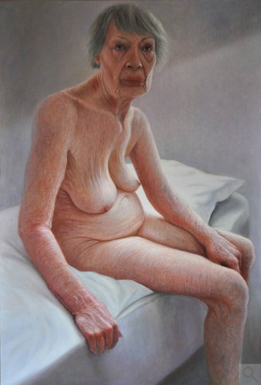 Francien Krieg é holandesa, tem 37 anos e dedica seu tempo e talento à pintura de figuras realistas femininas, com um foco e conceito bem particulares. Segundo a artista, “(…) uma pele lisa e polida é menos interessante que uma pele envelhecida. Pintar a pele assim, sem polimentos e com idade, é uma forma de expressar o interior.”