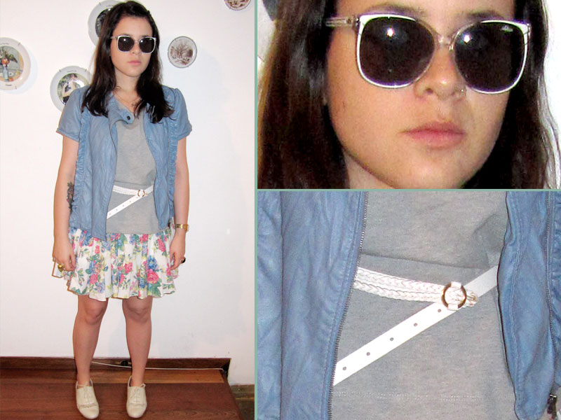 Domingo: “Dia de sair para visitar a minha avó e comer com o meu pai”. Mafê vai pra casa da avó com vestido e jaqueta couro fake azul Zara, sapato Brick Lane, cinto presente da minha mãe e óculos Marie Claire que eram do seu tio