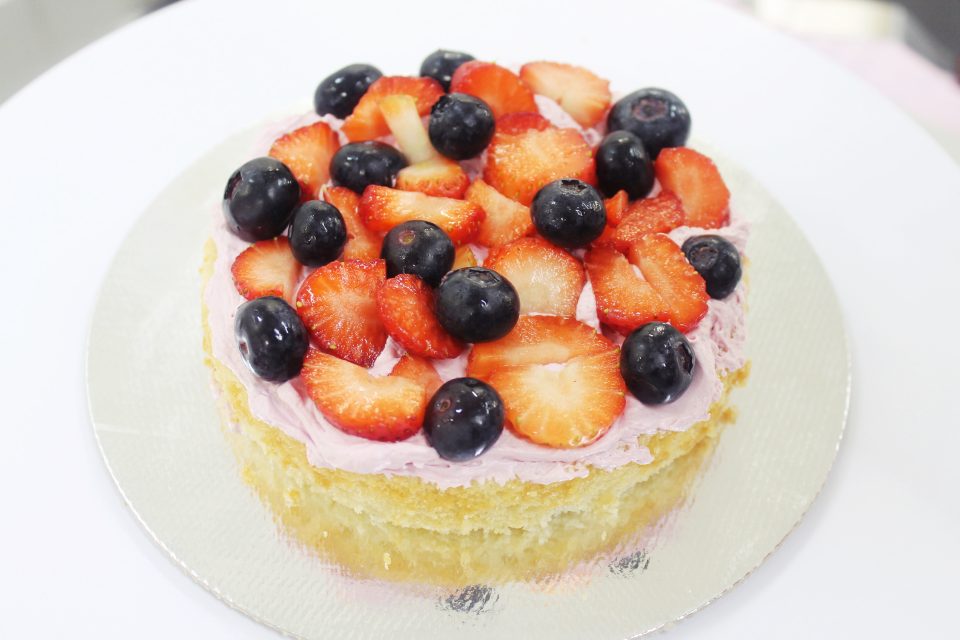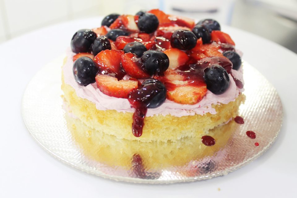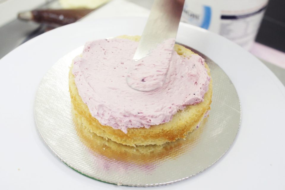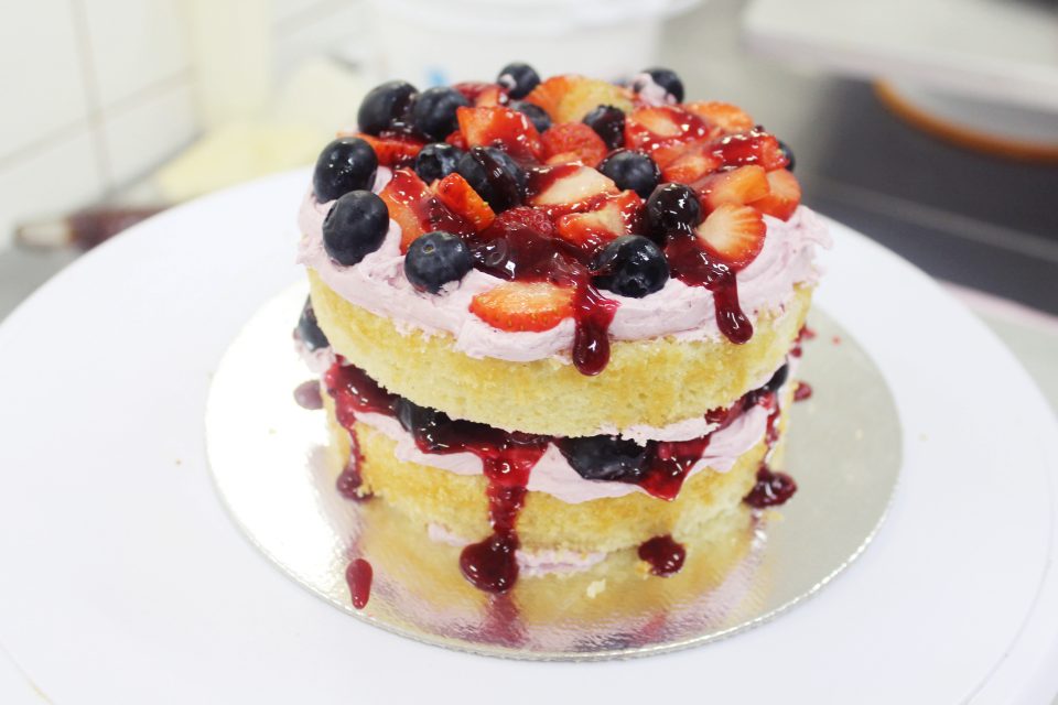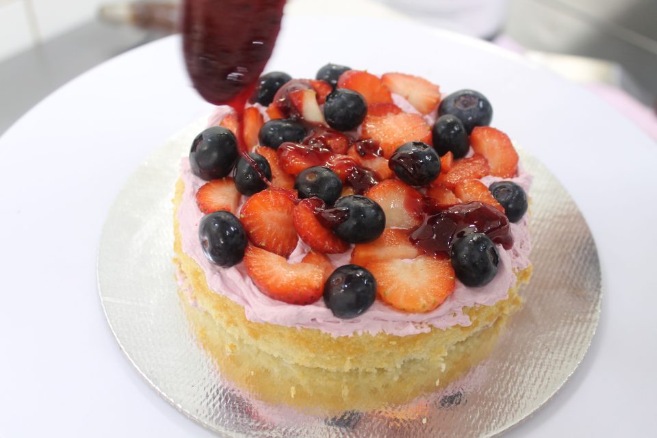 Coloque a 1ª camada de bolo já frio sobre o prato que vai recebê-lo. Coloque o butter cream (bastante!) e os pedaços de frutas vermelhas frescas de sua preferência, depois, geleia – também a de sua preferência. Cubra com a 2ª camada de massa. Coloque mais creme por cima, enfeite com mais frutas vermelhas e geleia, e então peneire açúcar de confeiteiro por todo o bolo.
