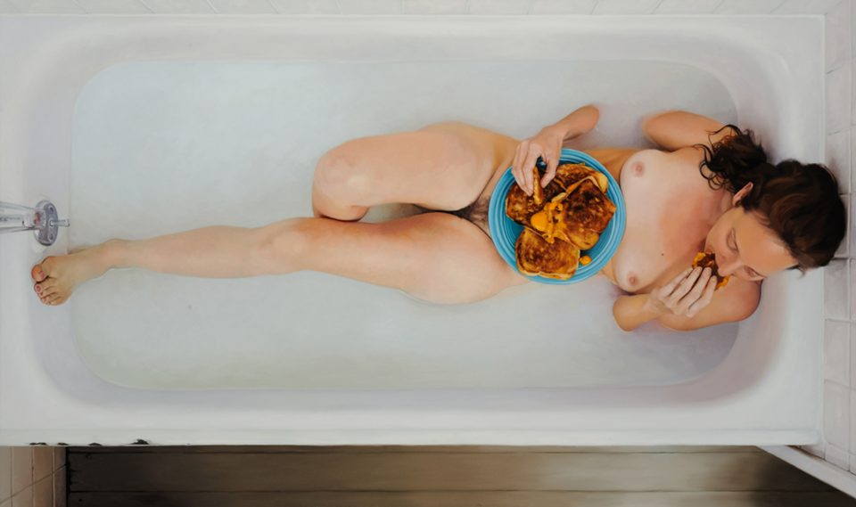 A pintora Lee Price, 46 anos, já fez algumas loucuras com comida: às vezes devorava uma torta inteira numa garfada ou comia 15 bolinhos, quando a fome pedia apenas um. Os exageros passariam despercebidos não fosse o tema central do trabalho de Lee, uma pintora hiperrealista de Nova York. Em muitos de seus quadros, ela mesma aparece nua na banheira, devorando potes de sorvete. As imagens são, ao mesmo tempo, leves e perturbadoras. Entram sem pedir licença na intimidade dela e, ali, entre quatro paredes de azulejo, mostram duas coisas normalmente escondidas, que são motivo de culpa para as mulheres: corpo e compulsão. Pintando as duas juntas, Lee diz buscar a nudez real, que só aparece quando estamos a sós. “O banheiro é privado, é para onde as pessoas levam seus segredos”, explica a pintora à Tpm. Mesmo sem teor sexual, as telas acabam expondo anseios também nessa área. “Na cultura em que cresci, comer demais era motivo de vergonha. O corpo e o sexo, idem.”