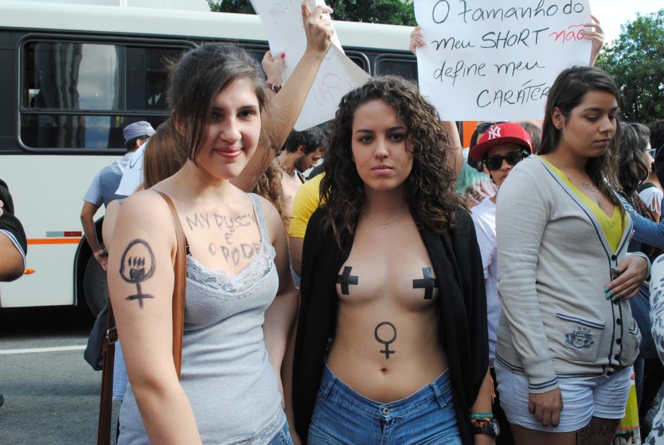 São Paulo, sábado, 25 de maio, meio dia em ponto: dois dias depois de uma psicóloga denunciar ter sido vítima de estupro quando seu carro havia quebrado e ela esperava por ajuda em um trecho da Marginal Tietê; na Praça dos Ciclistas (encontros das avenidas Paulista e Consolação) um grupo de mulheres munidas de batom, tinta, cartolina e pincéis, se reúne. Concentradas, escrevem cartazes e pintam o corpo – muitas vezes seminu – com frases que gritam respeito, pedem igualdade e rejeitam o lugar que não querem mais, o de culpadas. Elas estão alí pra terceira edição da Marcha das Vadias de São Paulo, que desta vez protesta pela quebra do silêncio na violência contra a mulher. Algumas são ativistas, fazem parte de coletivos feministas, outras são garotas comuns, estudantes, jornalistas, publicitárias, professoras, mas que compartilham o simples fato de serem mulheres e por isso não estão livres de situações de assédio.