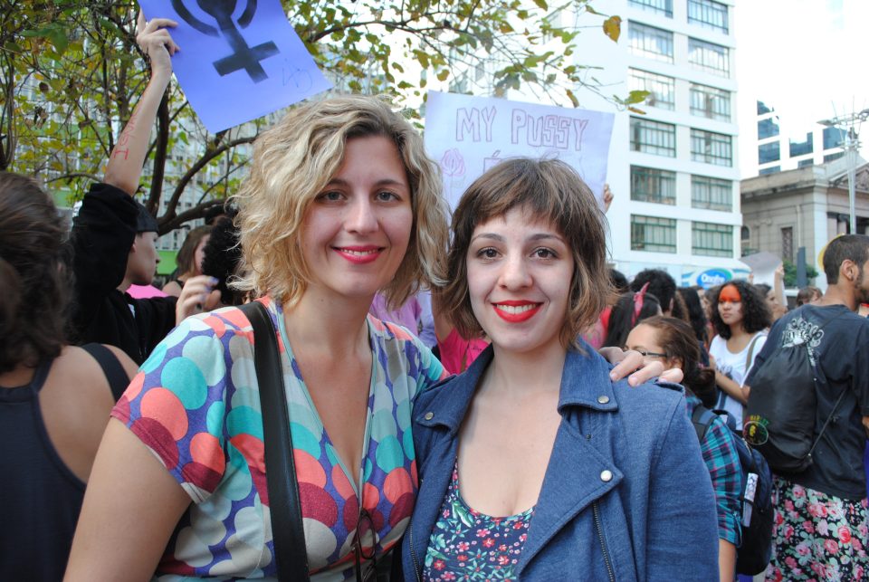 Katiuscia Esposito, 28, marchou com a filha Sofia, de dois anos, nos braços. Ela sentiu na pele, da pior forma possível, a violência pela qual a Marcha das Vadias protesta. “Quando eu tinha 16 anos, trabalhava em uma loja e o meu chefe dava em cima de mim. E eu não tinha desenvolvimento sexual nenhum, nunca tive nenhuma orientação sexual. Eu tive uma atração por ele, e aí eu acho que ele percebeu isso, só que ao mesmo tempo em que estava confusa porque sentia atração por ele, ele meio que forçou a barra. E o pior de tudo é que ele era meu chefe e eu vi isso como um tipo de ascensão no lugar que eu trabalhava. Então me senti bem mal por meio que vender o meu corpo, fazer sexo que eu não queria, foi tudo muito embrulhado e confuso, sabe? E isso fez com que eu tivesse um distúrbio alimentar, ou pelo menos piorasse alguma coisa que eu já tinha antes. E eu só consegui me curar desse distúrbio 10 anos depois. Eu nem tinha concebido isso como um estupro, justamente porque eu tinha essa queda por ele. Eu só fui ter a consciência de que era um estupro muito tempo depois, depois de começar a estudar o feminismo – por isso o feminismo é tão importante pra mim. E eu marcho por causa disso, para que minha filha não tenha que passar por esse tipo de coisa.”