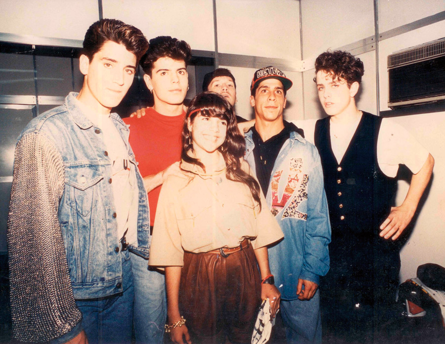 Com os ídolos do New Kids on the Block. Sorriso no backstage, decepção nos palcos: “Não dá para fazer um show num palco enorme sem produção, eles pareciam formiguinhas” / Créditos: Arquivo Pessoal