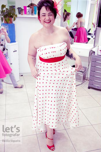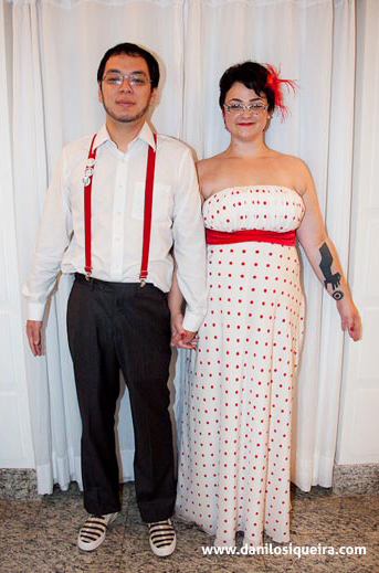 A noiva, que entrou no salão ao som de Wake Up, da banda canadense Arcade Fire, escolheu um vestido fofo branco com bolinhas vermelhas – cor que, inclusive, reinou em seu look: batom, esmalte, sapato, enfeite da cabeça e parte do cabelo: tudo vermelho. Yabu, pra combinar, usou suspensórios da mesma cor e, neles, pendurou broches ilustrados por ele mesmo.