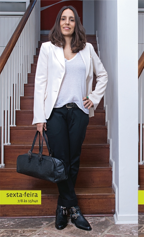 quinta-feira “Hoje vou a lojas de decoração, na [rua] Gabriel [Monteiro da Silva]. Procuro não seguir tendências, mas, sem perceber, nosso olhar é influenciado pelo que acontece em volta. É o caso deste blazer, peça que está se usando muito. À noite vou ficar em casa com meus filhos.” Blazer Miu Miu |
