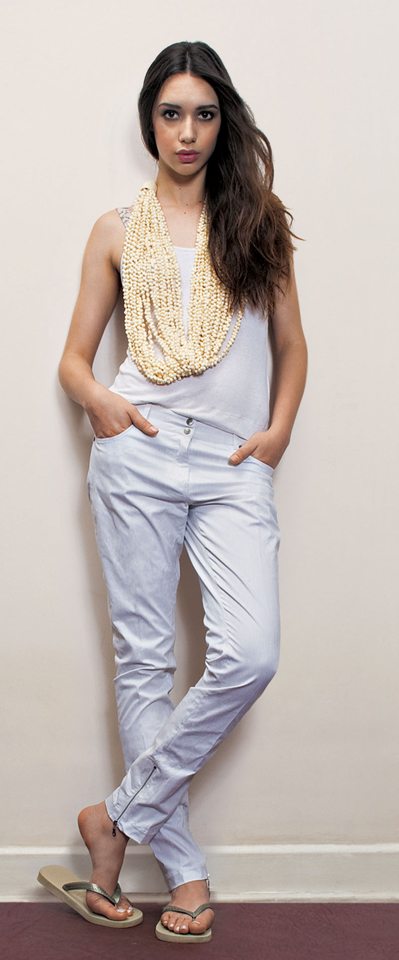 look 2Uma coisa bem baianas de Salvador, o colar é um espetáculo com a regatinha megassimples e a calça de sarja. Como aqui o negócio é nude, então é tudo nude. Poderia ser com brincos ou pulseiras junto. Mas pegue leve. Calça Ellus R$ 222 |