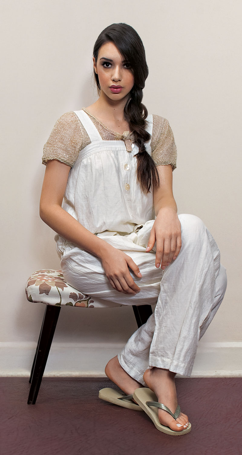 look 5Hit das útimas estações, o macacão é bem legal no verão. Este é leve e soltinho, ideal para usar com uma regata ou, neste caso, uma camisetinha. Se quiser variar, dobre a barra mais fininho, quase uma pescador. Dá um tchans. Macacão Cristine Ban R$ 607 |