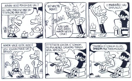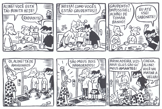 E já houve algum caso de mulheres que disseram ter se inspirado na Aline para se liberarem sexualmente? Acho que sim. Recebo mulheres que têm um, dois, três caras e se dizem ninfomaníacas, mas não lembro um caso específico de “isso mudou minha vida”. Já vi coisas negativas, como uma menina super careta que se chamava Aline e o pessoal da escola a zoava por causa do quadrinho. Teve até uma tese na USP criticando a Aline, dizendo que era “machismo invertido”. Machismo invertido! Nunca entendi que porra é essa. Parece que a tese não passou, deve ter sido mal escrita pra caralho.