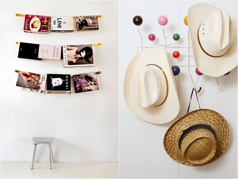 Outras duas ideias de penduricalhos: na foto da esquerda a parede vira um revisteiro; na da direita, uma outra espécie de cabideiro, dessa vez pra chapéus. Funcional novamente 😉