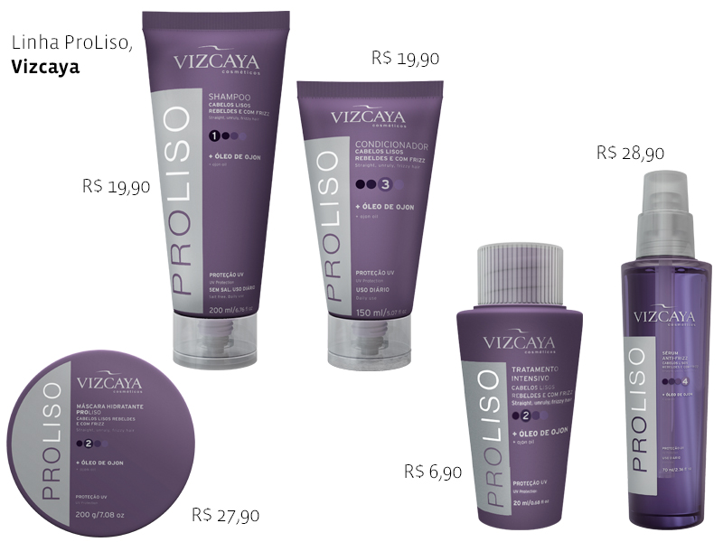 A linha ProLiso, da Vizcaya, promete disciplinar os cabelos lisos, deixando os fios ainda mais esticados, sem frizz e hidratados na medida certa. As novidades são o óleo de ojon – que promete ser o novo óleo de argan – e o uso de água termal na fórmula, ingrediente inédito em produtos para os cabelos. Para quem gosta do cabelo esticadão, a linha toda é uma maravilha. Destaque para o sérum, que é uma verdadeira maravilha: deixa o cabelo supermacio e não engordura nem pesa. E o cheirinho...