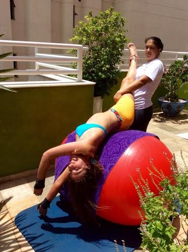 Estou sempre à procura de formas novas para revisitar movimentos que um dia fiz sozinha. Para isso uso muitas coisas simples que todo mundo pode ter em casa, como tiras de tecido para ajudar a suspender os braços para fazer as posições. Em alguns casos, uso também a eletroestimulação.
