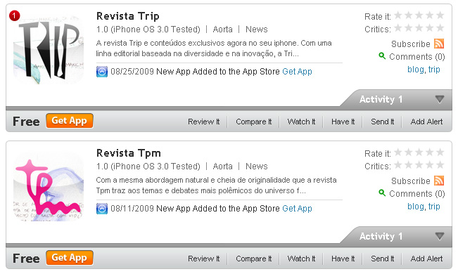 A Trip acaba de lançar na AppStore, loja oficial de downloads da Apple, aplicativos das revistas Trip e Tpm. Além de oferecer as principais reportagens e entrevistas da revista, este aplicativo traz conteúdos multimídia exclusivos, como os programas Trip FM, galerias de fotos e nossos blogs. Ambos os apps são gratuitos e requerem o firmware 2.0 ou superior de iPhones/iPods touch.