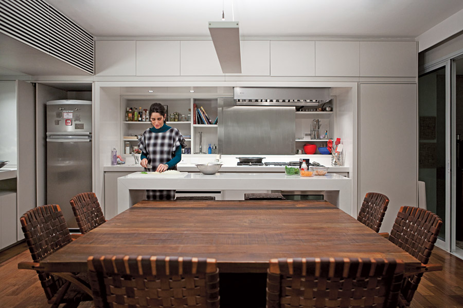 O apartamento tem também uma cozinha convencional, usada por sua funcionária. Mas a de Mayra é exclusiva porque sua especialidade é unir a gastronomia profissional à descontração de um lar. “Quero que as pessoas sintam o mesmo prazer aqui que têm num restaurante”, explica ela, sócia da Dedo de Moça, consultoria que ensina de receitas a organização da cozinha a quem possa interessar.