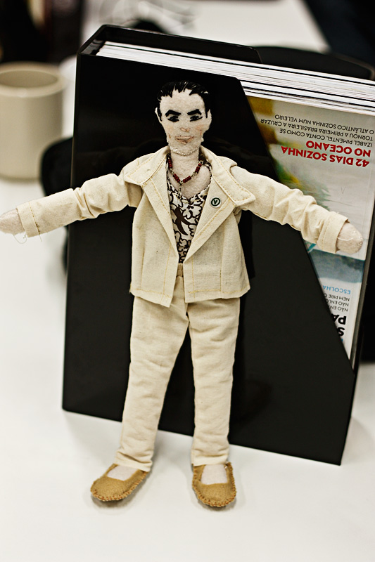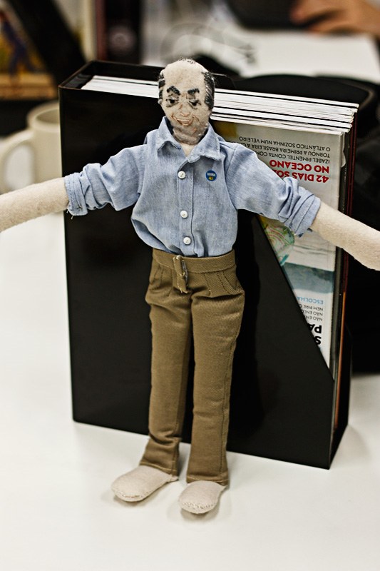 A semelhança dos vudus com seus donos é impressionante, ainda mais quando percebemos que nada disso passou pelo Photoshop. É tudo feito com tecido, linha, lã e agulha. Antes de começar a criação, Estefi faz uma extensa pesquisa de fotos. Como os bonecos são 3D é preciso saber como é a careca do Serra de costas, por exemplo. As expressões faciais que mais os marcam também são importantes, apesar de que o rosto a artista só faz depois que já está tudo pronto. “Preciso me sentir íntima deles para fazer a feição”, conta rindo.