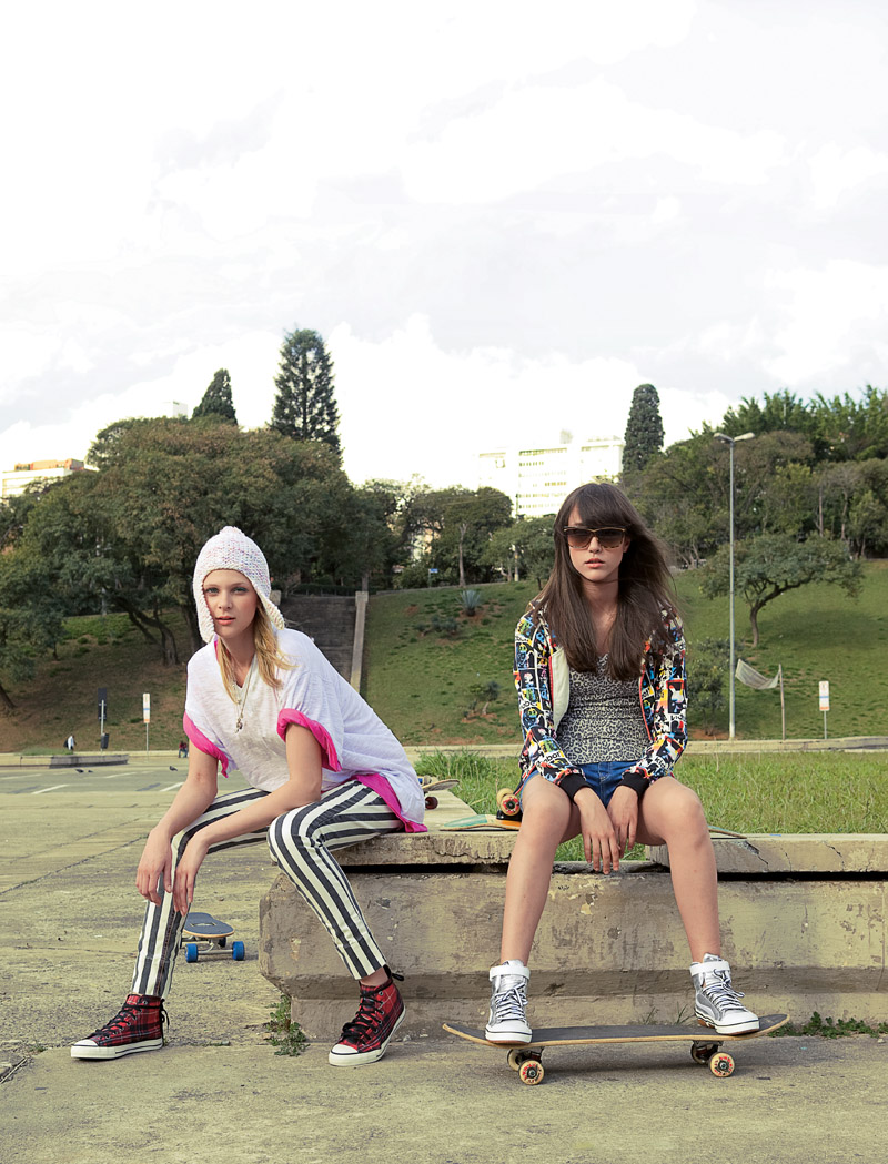 Loira: Camisetas Shoesserie R$ 89 cada, calça Element R$ 199, gorro Element R$ 139, tênis Converse R$ 140, correntes acervo produção. Morena: regata C&A R$ 30, casaco Kid Robot para Maze R$ 528, short Cantão R$ 172, óculos Von Zipper R$ 488, tênis Mi / Créditos: Marcos Vilas Boas
