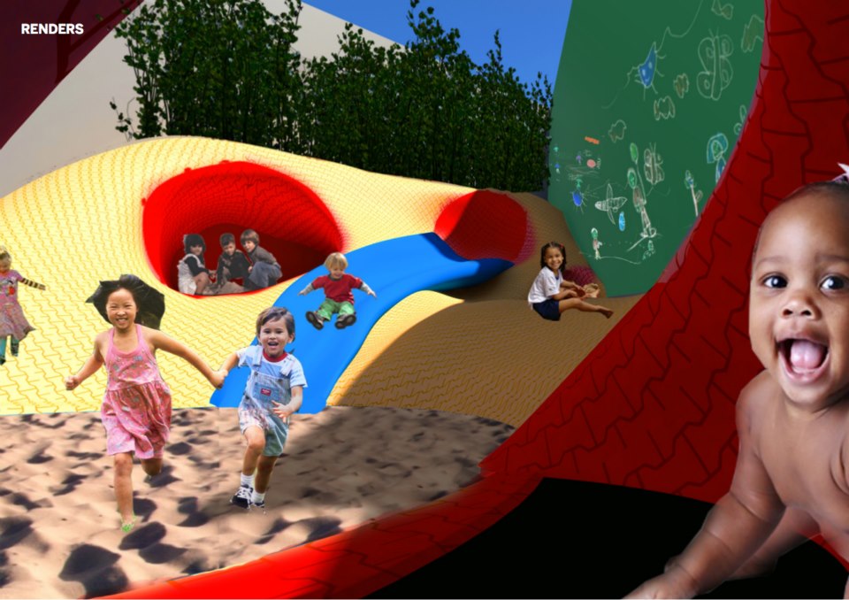 A ideia é construir o playground, numa área de 38 metros quadrados, com formas orgânicas e contínuas, inspiradas em paisagens naturais, onde objeto e espaço se mesclam, ganhando novas significações. Chamada de “arquitetura do relacionamento”, propõe romper os automatismos das relações humanas, em grande parte derivados de um espaço altamente hierarquizado e segmentado.
