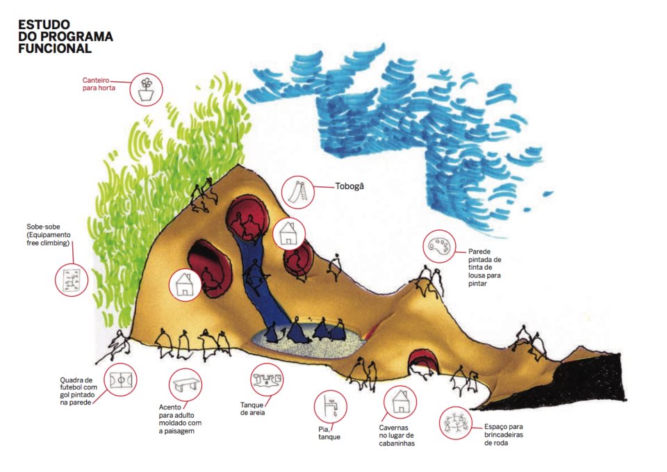 “Outro ponto importante é que a nossa ‘paisagem’ simula um mundo primordial de covas, rios, aldeias, hortas, para justamente fermentar uma organização social espontânea que nasce dos relacionamentos entre as crianças com essa topografia e com cuidar juntos de um bem comum a todos. O ‘nosso’ vira a palavra-chave desse relacionamento.”