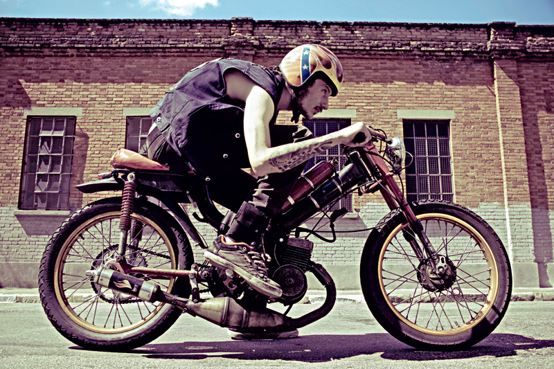 Acompanhada de um estridente barulho de motor, uma nuvem de fumaça branca cheirando a óleo queimado se espalha pelo ar. Enquanto alguns ensaiam caretas e balançam as mãos em frente ao rosto para dissipar a neblina, outros simplesmente fixam os olhos no grupo que passa sobre duas rodas. Cabeludos, sujos de graxa, cheios de piercings e tattoos, vestindo puídas roupas pretas e fazendo cara de mau, os integrantes do bando chamam a atenção de quem está por perto. Não por conta de sua casca, e sim porque as motos customizadas que estão dirigindo não são exatamente motos. São mobiletes.