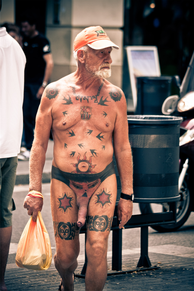 Habitada por uma fauna de artistas de rua, bêbados, golpistas e prostitutas, a via pedestre de Barcelona, conhecida como Las Ramblas, é a artéria turística da cidade. Entre 2006 e 2010, porém, nenhum atrativo foi páreo para o cozinheiro aposentado catalão Esteban Trancón Ejarque, 67 anos. Serenos olhos azuis, cabelos e barba brancos, ele cruzava os 2 quilômetros da rua (visitada diariamente por 225 mil turistas) a passo lento, portando apenas um boné, sandálias e um saco plástico nas mãos. E nada mais no resto do corpo. O impacto era duplo pelo aspecto de seu corpo, decorado com 21 tatuagens, e o tamanho de sua… er… tromba. Sim, tromba, porque os mais de 20 centímetros de pênis conectam-se a uma tatuagem de elefante e… o resto as fotos mostram. Completa o painel traçado à agulha uma célebre sunga tingida na bunda, um conjunto de andorinhas espalhadas pelo tronco – em tributo à liberdade – e o símbolo do Barça no peito, entre outras figuras.