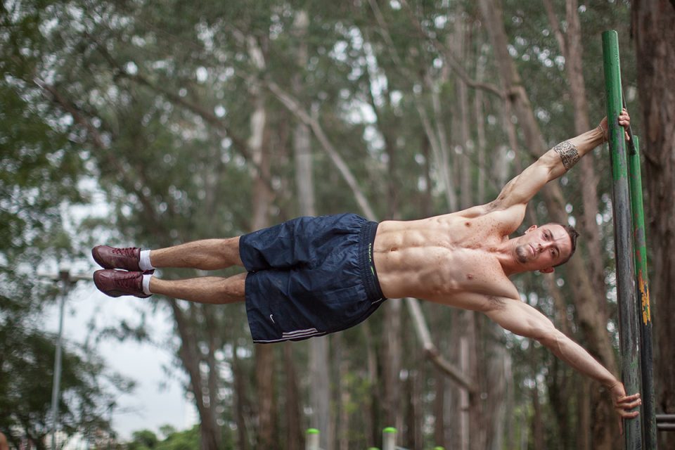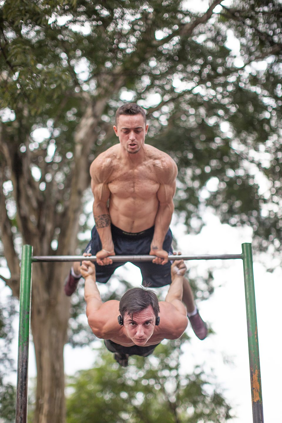 Foi um desses movimentos impressionantes, a chamada “bandeira humana” (em que o praticante sustenta o próprio corpo esticado na horizontal apenas com as mãos na barra, como um bandeira), que inspirou Luiz Otávio Mesquita, de 21 anos. “Eu descobri a calistenia vendo vídeos na internet. Comecei a tentar a bandeira humana e percebi que era muito difícil”, conta ele, que há pouco mais de um ano criou um grupo dedicado à prática, o Calistenia Brasil. “Tentei procurar informações a respeito no Brasil e não achei nada. Então pensei: vou aprender e tentar ensinar o pessoal.”