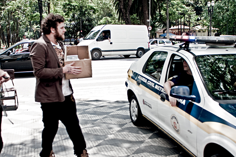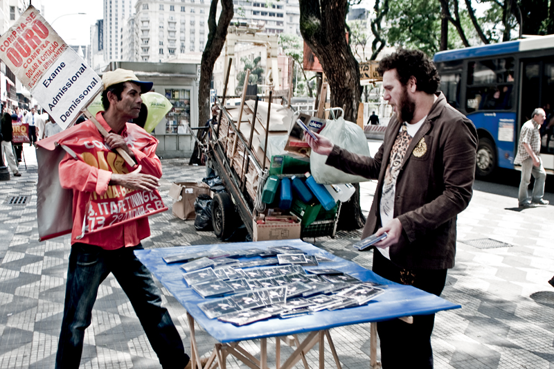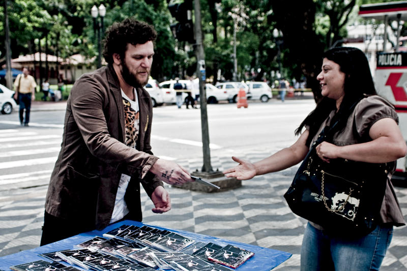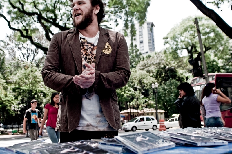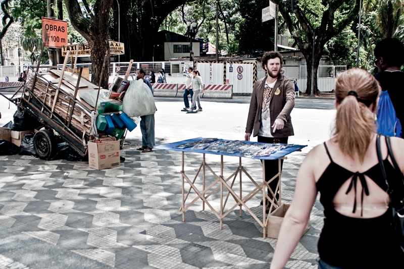 Foi tal fineza que Otto levou ao centro de São Paulo, a pedido da Trip, para posar de camelô de seu próprio CD. Lá qualquer sensação de ostracismo midiático que pode ter sofrido se desfaz. Menos de dez minutos parado na frente da Praça da República o povo cola em massa. Uns conhecem Otto, outros gostam da capa, a maioria pergunta quanto custa a bolachinha. Não está à venda. Apenas dublês de disco para a foto. Algo que Otto teve que explicar uma última vez para a polícia que, no fim da sessão, mandou desarmar a barraca. “Te conheço da TV, mas não pode vender mesmo assim…”, explica um gentil guarda dentro da viatura.