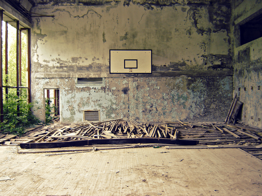Passamos por um conjunto de apartamentos e chegamos ao parque de diversões. A roda-gigante e o bate-bate ainda estão lá. Depois vêm o ginásio de esportes e uma escola, com livros espalhados para todo lado. Ainda há máscaras de proteção perdidas pelo chão, junto com cadernos infantis e bolas de basquete. Nas paredes, cartazes ensinam como colocar a máscara contra radiação. Outros mostram como montar corretamente um rifle de assalto. Começa a escurecer e Sergei chama todos para a van.
