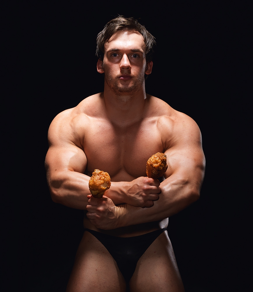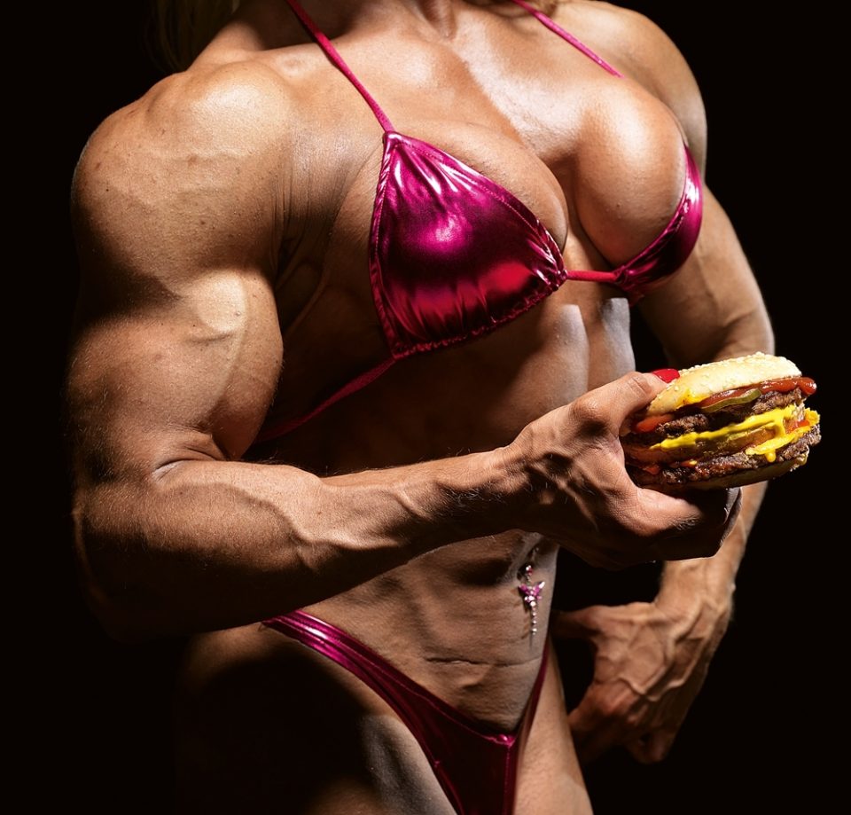 As imagens acima fazem parte da série The four horseman and the oesophagus (Os quatro cavaleiros e o esôfago), da fotógrafa inglesa Rebecca Andrews. O quarteto do título se refere às calóricas comidas que os fisiculturistas têm em mãos: hambúrguer, hot dog, frango frito e refrigerante.