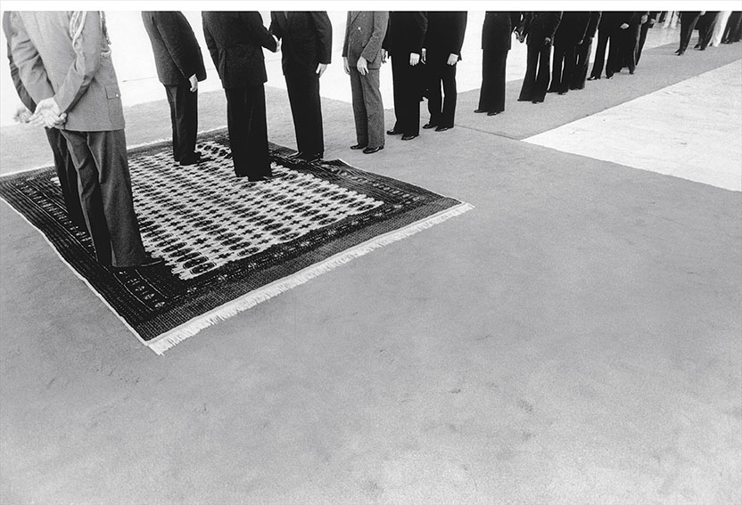 Foto 5) Uma fila de engravatados aguarda para cumprimentar militares que estão sobre um tapete persa em Brasília, durante a ditadura. Todos estão sem cabeça na foto – “Um retrato do comportamento padronizado da política nacional, nesse beija-mão cheio de cerimônias sem sentido. É essa a crítica que o fotógrafo faz ao retirar do enquadramento as cabeças, inclusive a do presidente Geisel.” Eder Chiodetto