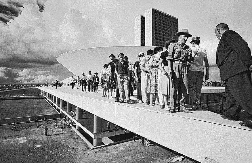 Foto 10) Pessoas andam sobre a laje da cobertura do Congresso Nacional no dia da inauguração de Brasília / “Uma imagem revisitada nas manifestações deste ano, quando as pessoas subiram no topo do Congresso, só que à noite. Serve de comentário sobre o povo no poder, além de ser um registro histórico.” Sergio Burgi