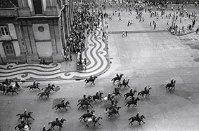 Foto 9) Vista do alto, a cavalaria avança sobre o povo na Igreja da Candelária no dia da missa em homenagem ao estudante morto pela polícia / “Sintetiza todo o sentimento de repressão no período da ditadura, não só do ano de 1968 como de todo o regime militar.” Boris Kossoy
