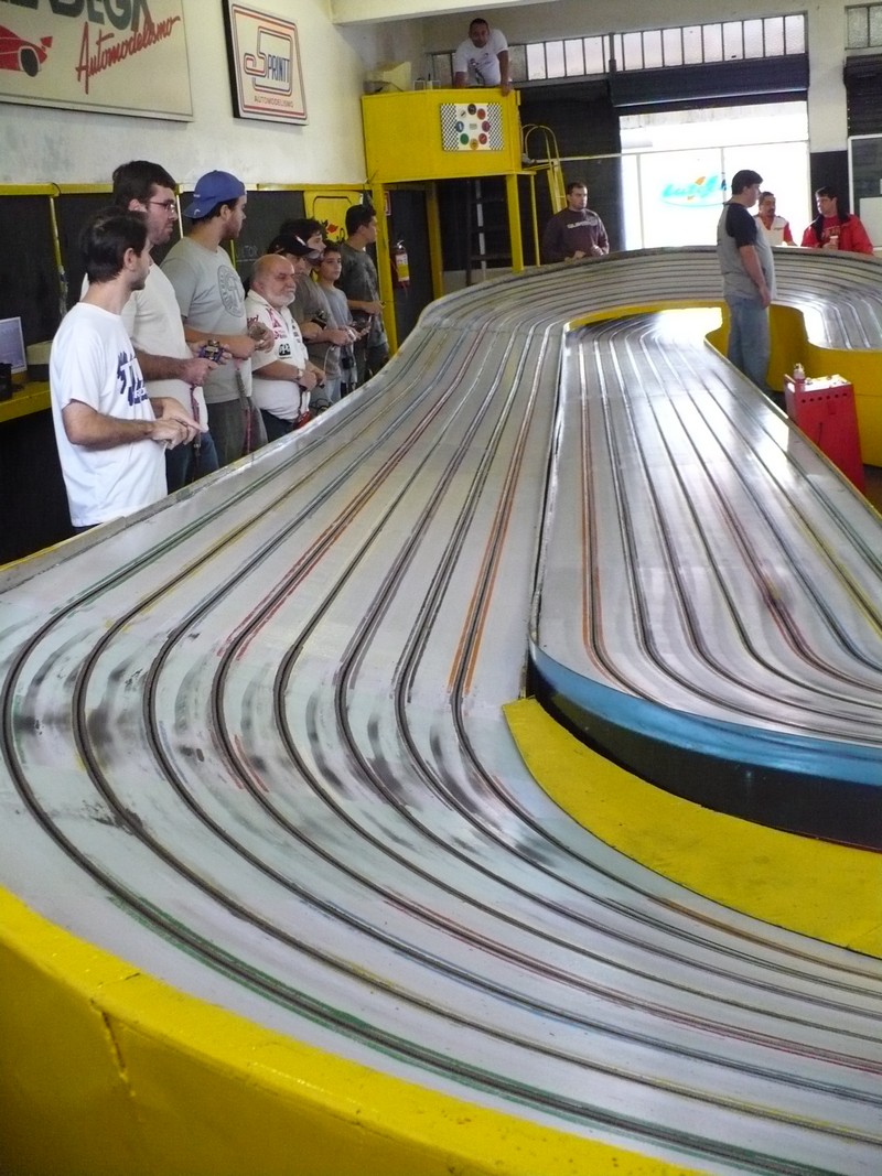 Apesar de ser um hobby, a tensão que se via na pista Talladega, em São Bernardo do Campo não deixava dúvida de que o pessoal estava levando o campeonato a sério. Uma maioria de quarentões e cinquentões disputava volta a volta (ganha quem completar o maior número delas) as baterias. A cada troca de fenda (são oito ao todo; todos andam em cada uma delas), os carros eram jogados por cima da pista para quem “fazia o boxe”. Troca de pneus, lubrificação, limpeza do contato elétrico, um pit stop de verdade, mas em miniatura. Os boxes são caixas propriamente ditas, de madeira ou metal, como as de pesca. Pequenas gavetas repletas de eixos, coroas, motores e centenas de micro-ferramentas fornecem o necessário para que o piloto e o carrinho continuem a rasgar as pequenas curvas e retas – uma pista oficial, chamada Blue King, tem 47 metros de extensão. Ninguém conversa, ninguém ri; durante as provas, a concentração é total. Ao longo da pista ficam “recolocadores”, responsáveis por reposicionar em sua fenda um carrinho errático – basicamente, são as pessoas que não estão participando daquela bateria e vão correr na próxima. Se não se apressam ou erram de fenda, a reclamação (no melhor dos casos) é imediata.