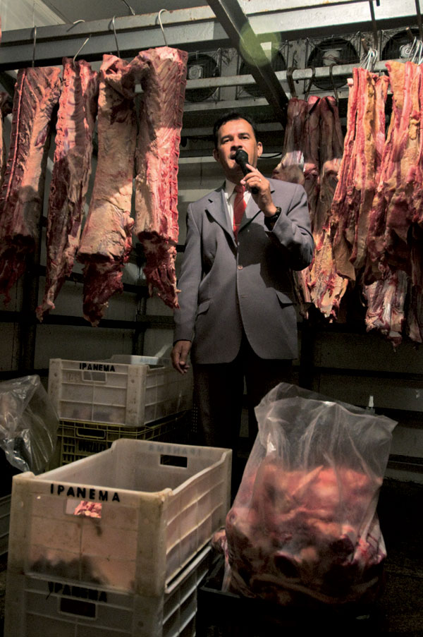 “Não vou poder ir trabalhar hoje! Estou com uma irritação na garganta porque nos últimos dias houve várias ofertas boas aí no açougue e eu tive que forçar muito a voz.” Que ironia. Dessa forma o locutor Franklin Júnior, 34, avisou por telefone ao chefe que faltaria ao batente bem no dia em que havia marcado o encontro com a reportagem da Trip. Ossos do ofício. Se para a maioria das pessoas as ofertas são sempre bem-vindas, para Franklin significam trabalho em dobro. Vida de locutor de açougue. Das nove da manhã às oito da noite, de segunda a sábado, ele está sempre com o microfone na mão soltando a voz para chamar a atenção dos clientes que passam pela casa de carnes em que trabalha, que tem várias unidades no bairro do Brás, em São Paulo. “O locutor tem que deixar o produto lindo”, explica. “A gente se empolga e acaba com a voz. Precisa disso pra fazer o marketing.” Admirador do radialista Eli Corrêa e fã do apresentador Silvio Santos, Franklin começou com a chamada locução de marketing por acaso. Quando tinha 20 anos de idade e trabalhava como vendedor em uma confecção, aproveitou um dia de ausência do locutor oficial da loja para fazer seus primeiros anúncios. Nunca mais parou. Trabalhou por oito anos fazendo locução em supermercados e depois partiu para a vida de anunciante de bistecas e picanhas. “Agradeço a Deus que me deu esse dom. Eu amo minha profissão”, confessa. Que venha o churrasco. (CF)