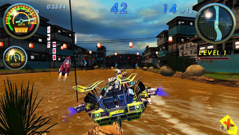 H2Overdrive - Se dissecado, o game revela traços das corridas de pods do Star Wars, jogabilidade inspirada em clássicos como F-Zero e frenesi comparável a títulos como Burnout. Tudo isso acontece sobre a água, onde o jogador pilota lanchas turbinadas em alta velocidade capazes de destruir mais obstáculos que o contrário. / Créditos: Divulgação