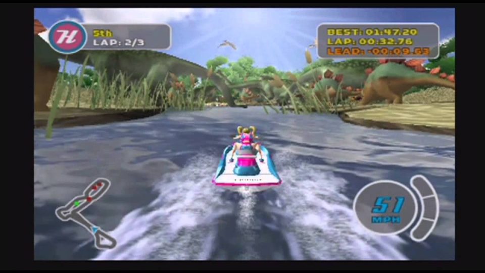 Splashdown - O jogo traz para o console um dos simuladores mais legais dos fliperamas, mas sem seu grande chamariz. Mesmo que seja só no controle, pilotar um jet ski numa corrida aquática pode ser divertido. As pistas, como de costume, espalham-se em vários lugares do mundo. Os trajetos são cheios de rampas e, além de chegar em primeiro, fazer algumas manobras aéreas é um objetivo. / Créditos: Divulgação
