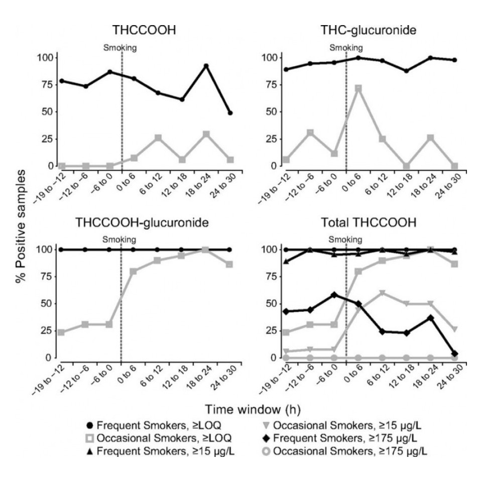 Abaixo uns gráficos bem interessantes pra quem quiser mergulhar no assunto mais cientificamente, mas, em resumo, usuários eventuais praticamente não correm risco de se serem pegos, e mesmo usuários frequentes que fizerem uma abstinência de pouco mais de 30 horas podem ficar sossegados.