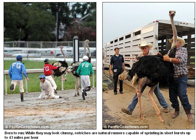 Os bichinhos montados pelos jóqueis chegam a 140 kg e até 68 km/h. Em velocidade constante, as aves chegam a manter 50km/h, nada mal para um pássaro que não sabe como voar. Os avestruzes são a maior ave viva no mundo, superando emus, emas, nandus e casuares. Eles podem passar dos dois metros de altura e chegar até a 45 anos de idade.