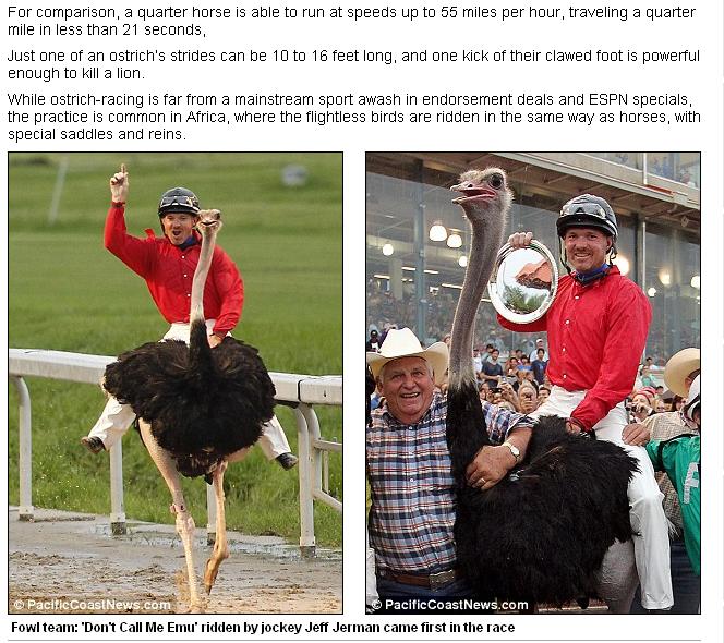 Praticada há séculos nas regiões mais ao sul do continente africano, a corrida de avestruzes está muito longe de ser um esporte mainstream. Mesmo com praticantes dedicados por toda a África, especialmente na África do Sul, onde o esporte é considerado patrimônio nacional, o maior de todos os páreos com jóqueis montando as aves gigantes acontece anualmente na New Orleans Fair Grounds Race, no estado americano da Louisiana.