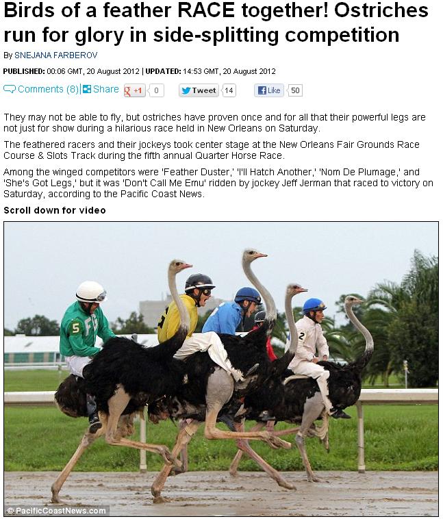 A última edição do luxuoso páreo aconteceu no dia 19 de agosto, durante a quinta edição do evento equestre da cidade. A corrida de avestruzes é um evento paralelo ao grande prêmio de hipismo, mas é essa modalidade que chama mais a atenção entre todas as corridas. Com nomes como Feather Duster (espanador de pena), I’ll Hatch Another (chocarei mais um), She’s Got Legs (ela tem pernas) e Don’t Call Me Emu (não me chame de emu), as aves roubaram a cena no clube de turfe de Nova Orleans, com o último vencendo o páreo, o prêmio em dinheiro e ainda o campeonato moral de melhor nome de animal de corrida de todos os tempos.